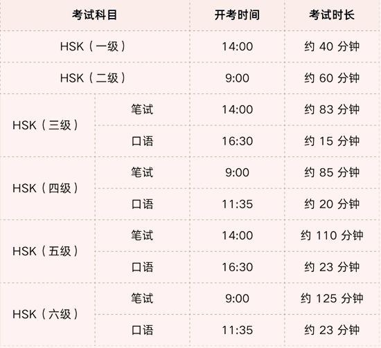 注:1.以上均为当地时间。2.纸笔考试包含填写5分钟个人信息及3-5分钟填涂答题卡时间,口语考试包含准备时间。